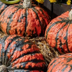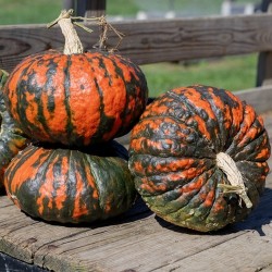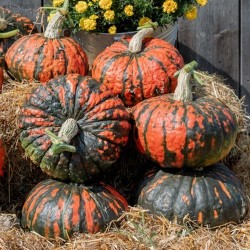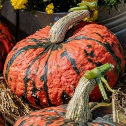 We zijn erg blij dat we het mooie sortiment van Outstanding Seed Company kunnen verkopen. Dit Amerikaanse bedrijf uit Beaver Falls (Pennsylvania) is gespecialiseerd in het kweken en verbeteren (door traditionele veredeling) van pompoenen. Ze letten daarbij op verbetering van kleur, vorm, smaak, ziekteresistentie, oogsttijdstip, oogstgrootte en bewaarbaarheid. Fijn om rechtstreeks bij de bron te kunnen kopen! Opvallend, lekker en ziekteresistent! Zo kan je deze prachtige, pompoen typeren... De planten zijn sterk bestand tegen meeldauw, je kan dus een goede oogst verwachten van deze dieprode vruchten met zwarte marmering (of zwart met rode marmering). De schil is uniek ruw, met bobbels en herbergt smakelijk vruchtvlees.