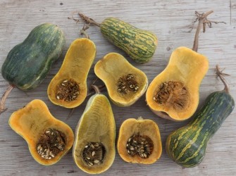 Pompoenen kunnen probleemloos buiten worden geteeld. De groeitoppen kunnen regelmatig worden gesnoeid en zijn eetbaar! Oogsten tijdens droog weer geeft de beste bewaarbaarheid. Alle pompoenen zijn eetbaar! Bij sommige soorten vermelden we de synoniemen, dat zijn de namen waaronder het soort ook bekend is. Bij andere soorten vermelden we zeer gelijkende soorten, heeft u duidelijk voorkeur voor een van die bij elkaar vermelde soorten, geef dat dan duidelijk aan. Ze mogen dan hun uiterlijk niet mee hebben, de smaak van deze flespompoenen is uitzonderlijk goed en uniek! Onze tuinvriend Gabriel uit Zwitserland heeft deze bijzondere vruchten voor ons vermeerderd. Van oorsprong komt dit ras uit Guatemala, het vruchtvlees is groenig en wordt zowel rauw gegeten als gekookt of gebakken. De smaak heeft ons weggeblazen: rauw proefden we hints van tropisch fruit zoals papaja of banaan. Gekookt komt de prettig zoete smaak zelfs nog beter tot zijn recht... We zijn trots en blij, dat deze unieke pompoen nu ook in Europa te bewonderen is!