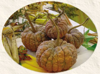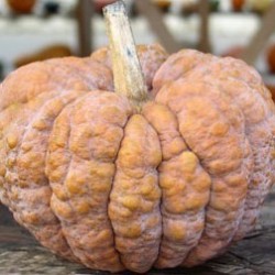 Pompoenen kunnen probleemloos buiten worden geteeld. De groeitoppen kunnen regelmatig worden gesnoeid en zijn eetbaar! Oogsten tijdens droog weer geeft de beste bewaarbaarheid. Alle pompoenen zijn eetbaar! Bij sommige soorten vermelden we de synoniemen, dat zijn de namen waaronder het soort ook bekend is. Bij andere soorten vermelden we zeer gelijkende soorten, heeft u duidelijk voorkeur voor een van die bij elkaar vermelde soorten, geef dat dan duidelijk aan. Een grappig, klein pompoentje, dat vrij laat ontwikkelt, maar dan ook in groten getale! De vruchten wegen maximaal 1 kg en zijn 10-15 cm doorsnee. Het oppervlakte is sierlijk geplooid en als een oud stuk leer gerimpeld. Onrijp zijn de vruchten donkergroen (oogststadium) en ze rijpen naar beigebruin. Voor wie vergelijkt: Zeer lang houdbaar en een zachte, iets zoete smaak.