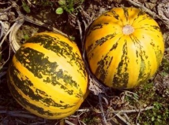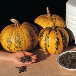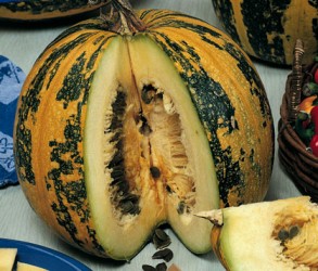 Pompoenen kunnen probleemloos buiten worden geteeld. De groeitoppen kunnen regelmatig worden gesnoeid en zijn eetbaar! Oogsten tijdens droog weer geeft de beste bewaarbaarheid. Alle pompoenen zijn eetbaar! Bij sommige soorten vermelden we de synoniemen, dat zijn de namen waaronder het soort ook bekend is. Bij andere soorten vermelden we zeer gelijkende soorten, heeft u duidelijk voorkeur voor een van die bij elkaar vermelde soorten, geef dat dan duidelijk aan. Snelgroeiende pompoen, die tussen de 20 en 30 cm in doorsnee wordt en 2-4 kg weegt. De huidkleur is oranjegeel met groene strepen, vlekken en stippen. (Als een landkaart verdeeld over de vrucht). Dit soort is middenlang houdbaar (3-4 maanden). Een bijzonderheid zijn de eetbare, zachte zaden (zgn. ‘blote’ zaden, waar het soort de naam Lady Godiva aan dankt), die bijvoorbeeld geroosterd of in brood meegebakken kunnen worden gegeten. Heel gezond! In Oostenrijk wordt deze soort gebruikt om een heerlijke olie uit te persen (Ölkürbis). Tenslotte is het vruchtvlees prima voor de soep, over veelzijdigheid gesproken…
