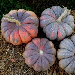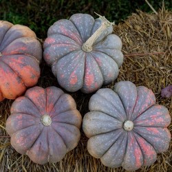Weer een beauty met als toegift veel smaak en betrouwbare ziekteresistentie. De rankende planten dragen veel vruchten van 20-25 cm doorsnee en ongeveer 15 cm hoog. De pompoenen zijn prachtig paarsgrijs gemarmerd met perzikrood, sommige vruchten hebben verschillende tinten blauw tot grijs en veel vruchten zijn gespikkeld. Je kan de meeste van deze scherp geribde pompoenen goed stapelen, gemiddeld wegen ze 6-7 kg.