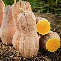 Langwerpig met een “buikje” en een ruwe geaderde schil. De rijpe kleur is warmbeige. Dit is de grote en ruwe versie van het butternut-type, het vruchtvlees is boterzacht en lekker, door de ruwe schil zijn de vruchten veel langer houdbaar.