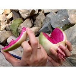 roze binnenkant, de doorgesneden plakjes zijn dus roze met een wit randje: aantrekkelijk voor salades en prima van smaak. Zaaien vanaf juni geeft overigens de beste resultaten. (Dosering: 15 g p/100 m2 -bij voorzaaien in perspot-, 100 g p/100 m2 bij direct zaaien)