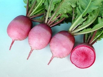 Wat een schoonheid! Deze grote Chinese radijs oogst je als de knollen 10 cm in doorsnee zijn, het bovengrondse deel van de knollen zijn knalrood, onder de grond verschuilt zich de lichtroze kleur. Het grote geheim geeft de knol prijs bij het doorsnijden: Van uit het centrum diep rozerood overgaand in wit en afgewerkt met een scherp rood randje: aantrekkelijk voor salades en fris, sappig en prettig pittig van smaak. Zaaien vanaf juni geeft overigens de beste resultaten.