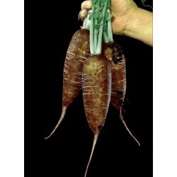 Zeldzaamheid! We vermoeden, dat dit een oude variƫteit is, maar kunnen geen oorsprong vinden. De halflange wortels zijn eikenbruin en helderwit van binnen. Lekker scherp van smaak, geschikt voor vroege- en zomerteelt.