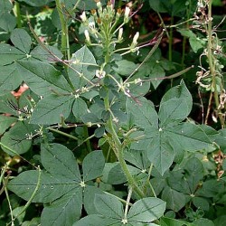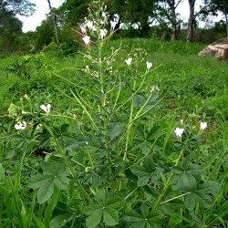 Sierlijk, eetbaar en medicinaal! Inmiddels is de plant in de hele tropen bekend, in India en Oost- tot Zuid-Afrika wordt de plant druk gebruikt: het jonge blad, de jonge scheuten en soms de bloemen worden verwerkt in roerbak-, stoof- of soepgerechten. De smaak is stevig en wordt vaak met melk of zure room verzacht. In India wordt deze sterke smaak gebruikt juist gebruikt in kerrie. De zaden zijn een vervanging voor mosterd, maar op het water gegooid komen de vissen boven drijven..! Van het blad wordt een versterkend en regulerend middel getrokken en de wortel wordt als pijnstiller gebruikt. Laat je al die toepassingen aan je voorbij gaan, dan blijft een mooie plant over met vingervormig blad en een subtiele, witte bloemtrossen, een familielid van de kattensnor. Hoogte 60-100 cm.