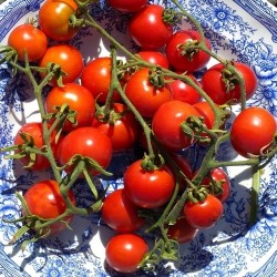 De kleinste tomaatjes in ons sortiment noemen we kerstomaatjes of pingpongtomaatjes, naargelang de grootte. Enkele variëteiten zijn langwerpig of hartvormig en krijgen navenant een iets andere benaming. Sommige zijn zelfs oorspronkelijke, wilde soorten. De meesten smaken extra zoet, een enkeling heeft een zoetzure smaak. Kerstomaten liggen het dichtst bij de oorspronkelijke soorten, wellicht daardoor zijn ze o.h.a. beter bestand tegen de gevreesde aardappelziekte. Dit prachtige, historische ras uit Rusland geeft een grote oogst aan de struikvormige planten. Weer een zeer goed aangepast ras voor ons koele klimaat, ze kunnen ook tegen veel wind, bijvoorbeeld op een dakterras. De rode, smakelijke vruchtjes zijn ongeveer zo groot als een pingpongbal en wegen rond de 50 g.