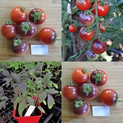 De kleinste tomaatjes in ons sortiment noemen we kerstomaatjes of pingpongtomaatjes, naargelang de grootte. Enkele variëteiten zijn langwerpig of hartvormig en krijgen navenant een iets andere benaming. Sommige zijn zelfs oorspronkelijke, wilde soorten. De meesten smaken extra zoet, een enkeling heeft een zoetzure smaak. Kerstomaten liggen het dichtst bij de oorspronkelijke soorten, wellicht daardoor zijn ze o.h.a. beter bestand tegen de gevreesde aardappelziekte. De verbazing begint al bij de jonge planten: Het blad kleurt purpergroen! De vruchtjes kleuren van groen, via geel en oranje naar dieprood, steeds met een dieper wordende blauwe hoed. Al die 5 kleuren sieren de plant tot een bonte pracht. Deze kerstomaat bewaart lang en de planten zijn zeer goed bestand tegen Phytophthora.