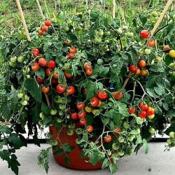 Een ideale tomaat om in een pot of in de tuin (buiten) te kweken, ze worden 60 cm hoog en breed en geven een flinke oogst van lekker zoete vruchtjes, 300 vruchtjes van 1 plant is geen uitzondering!