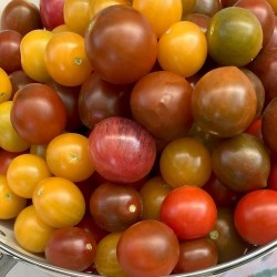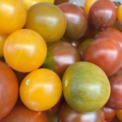 De kleinste tomaatjes in ons sortiment noemen we kerstomaatjes of pingpongtomaatjes, naargelang de grootte. Enkele variëteiten zijn langwerpig of hartvormig en krijgen navenant een iets andere benaming. Sommige zijn zelfs oorspronkelijke, wilde soorten. De meesten smaken extra zoet, een enkeling heeft een zoetzure smaak. Kerstomaten liggen het dichtst bij de oorspronkelijke soorten, wellicht daardoor zijn ze o.h.a. beter bestand tegen de gevreesde aardappelziekte. Onze Belgische kweker kruist ijverig en secuur de beste en meest veelkleurige planten! Hieruit ontstond deze vrolijke mix van kerstomaatjes, de planten zijn min of meer compact en kunnen zowel in de kas als in de vollegrond groeien. Bij een erg nat jaar is het wijs om de planten onder een afdak te plaatsen, nat gewas geeft eerder ziekten…
