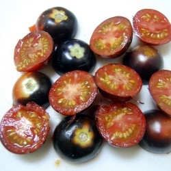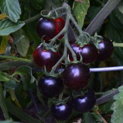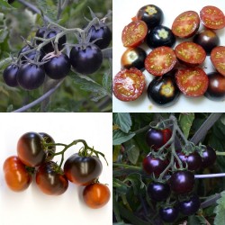De kleinste tomaatjes in ons sortiment noemen we kerstomaatjes of pingpongtomaatjes, naargelang de grootte. Enkele variëteiten zijn langwerpig of hartvormig en krijgen navenant een iets andere benaming. Sommige zijn zelfs oorspronkelijke, wilde soorten. De meesten smaken extra zoet, een enkeling heeft een zoetzure smaak. Kerstomaten liggen het dichtst bij de oorspronkelijke soorten, wellicht daardoor zijn ze o.h.a. beter bestand tegen de gevreesde aardappelziekte. Prachtig diepblauw van boven en (eerst geel en later) rood onderaan de vruchtjes. Deze iets grotere kerstomaat heeft de goede smaak van een rood tomaatje in deze bijzondere blauwe kleur dankzij het hoge gehalte anthocyaan. Dit gezonde ras van Tom Wagner is een van de vele topresultaten van deze zeer vruchtbare kweker. De groei is tamelijk compact, we noemen dit een struiktomaat, ongeveer 100 cm hoog.