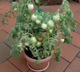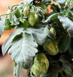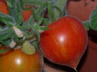 De kleinste tomaatjes in ons sortiment noemen we kerstomaatjes of pingpongtomaatjes, naargelang de grootte. Enkele variëteiten zijn langwerpig of hartvormig en krijgen navenant een iets andere benaming. Sommige zijn zelfs oorspronkelijke, wilde soorten. De meesten smaken extra zoet, een enkeling heeft een zoetzure smaak. Kerstomaten liggen het dichtst bij de oorspronkelijke soorten, wellicht daardoor zijn ze o.h.a. beter bestand tegen de gevreesde aardappelziekte. Geweldig mooie plant, compact van groei (30-60 cm hoogte slechts) en zowel de bladeren en de vruchten zijn sierlijk behaard. Ideaal voor potten, balkonbakken, vierkante metertuintjes etc. De rode, iets geel gemarmerde vruchten zijn wat verschillende in grootte, van zeer klein tot klein, zoet en zacht van smaak.