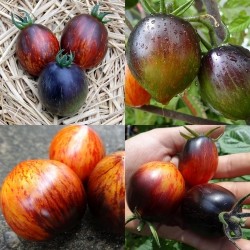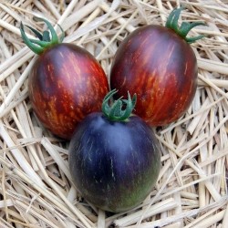 De kleinste tomaatjes in ons sortiment noemen we kerstomaatjes of pingpongtomaatjes, naargelang de grootte. Enkele variëteiten zijn langwerpig of hartvormig en krijgen navenant een iets andere benaming. Sommige zijn zelfs oorspronkelijke, wilde soorten. De meesten smaken extra zoet, een enkeling heeft een zoetzure smaak. Kerstomaten liggen het dichtst bij de oorspronkelijke soorten, wellicht daardoor zijn ze o.h.a. beter bestand tegen de gevreesde aardappelziekte. Hij krijgt nooit een Smurf te pakken, laat ik de naam van die arme tovenaar aan een interessant tomaatje geven... dit zijn de woorden van Phil Seneca van Good Mind Seeds, die deze toevallige kruising tussen zijn tomatenproeven vond. Er ontstond een mooie mix van recessieve en dominante eigenschappen met inbegrip van paarsgekleurde stengels en bladeren. Deze hybride toont de kenmerken van de besttomaat (L. pimpinellifolium) en de Peruviaanse tomaat (L. peruvianum) en is nog niet volledig uitgemendeld, dus je kan verschillende vruchtvormen verwachten, de meeste rond met een uitlopend puntje (hartvorm) en rood, geel en veel paars van het gezonde anthocyaan. De smaak is indrukwekkend voor een anthocyaan tomaat, want de meeste paarse tomaten missen de rijke tomatensmaak. Een ander indrukwekkend aspect van de vruchten is de lange houdbaarheid, buiten de koelkast kan dit maandenlang zijn! De oogst is vroeg en tamelijk groot, de planten zijn meestal klimmend.