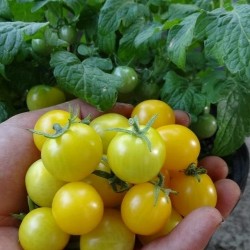 De kleinste tomaatjes in ons sortiment noemen we kerstomaatjes of pingpongtomaatjes, naargelang de grootte. Enkele variëteiten zijn langwerpig of hartvormig en krijgen navenant een iets andere benaming. Sommige zijn zelfs oorspronkelijke, wilde soorten. De meesten smaken extra zoet, een enkeling heeft een zoetzure smaak. Kerstomaten liggen het dichtst bij de oorspronkelijke soorten, wellicht daardoor zijn ze o.h.a. beter bestand tegen de gevreesde aardappelziekte. De zeer compacte plantjes worden nauwelijks hoger dan 20 cm, hebben zeer stevig blad en dragen schattige, gele kerstomaatjes. De opbrengst valt zowaar niet tegen voor zo’n dwergje, dit ras leent zich ook uitstekend voor de teelt in de winter onder onze LED plantenlampen! De smaak is voor zo’n dwerg zeker niet verkeerd.