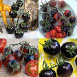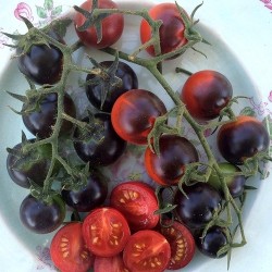 De kleinste tomaatjes in ons sortiment noemen we kerstomaatjes of pingpongtomaatjes, naargelang de grootte. Enkele variëteiten zijn langwerpig of hartvormig en krijgen navenant een iets andere benaming. Sommige zijn zelfs oorspronkelijke, wilde soorten. De meesten smaken extra zoet, een enkeling heeft een zoetzure smaak. Kerstomaten liggen het dichtst bij de oorspronkelijke soorten, wellicht daardoor zijn ze o.h.a. beter bestand tegen de gevreesde aardappelziekte. Prachtige blauwe kerstomaatjes (hoe meer zon hoe blauwer) groeien aan flinke trossen. Het subtiele aroma kent tonen zoet en zuur, een lekker en gezond tomaatje! De klimmende planten geven een enorme oogst. Dit ras kweekte Tom Wagner speciaal voor de Helsing Junction Farm in Rochester.