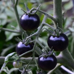 De kleinste tomaatjes in ons sortiment noemen we kerstomaatjes of pingpongtomaatjes, naargelang de grootte. Enkele variëteiten zijn langwerpig of hartvormig en krijgen navenant een iets andere benaming. Sommige zijn zelfs oorspronkelijke, wilde soorten. De meesten smaken extra zoet, een enkeling heeft een zoetzure smaak. Kerstomaten liggen het dichtst bij de oorspronkelijke soorten, wellicht daardoor zijn ze o.h.a. beter bestand tegen de gevreesde aardappelziekte. Weer een blauwe topper van Tom Wagner! Flinke trossen met 8-16 kerstomaatjes in een diepblauwe kleur... hoe meer zon hoe dieper de kleur. De smaak is bijzonder goed, een beetje zuur en een beetje zoet! De blauwe kleur bouwt zich op door de gezonde stof anthocyaan.