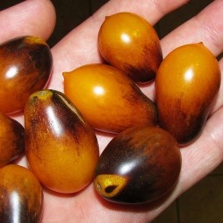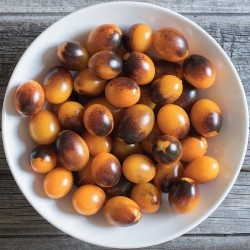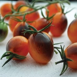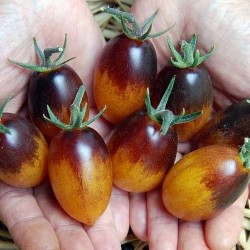 De kleinste tomaatjes in ons sortiment noemen we kerstomaatjes of pingpongtomaatjes, naargelang de grootte. Enkele variëteiten zijn langwerpig of hartvormig en krijgen navenant een iets andere benaming. Sommige zijn zelfs oorspronkelijke, wilde soorten. De meesten smaken extra zoet, een enkeling heeft een zoetzure smaak. Kerstomaten liggen het dichtst bij de oorspronkelijke soorten, wellicht daardoor zijn ze o.h.a. beter bestand tegen de gevreesde aardappelziekte. Oogstrelend en verrassend: de ovaalronde, kleine vruchtjes (15-25 g) zijn lichtoranje met paarsbruine bovenzijde, net een chocodip! Om deze bijzondere kleur te behouden moet je het echt hebben van de eerste (F1) kruising, vandaar de wat hogere prijs. De planten geven een grote oogst en de snoepvruchtjes smaken lekker zoet met een verrassend zuurtje. Elk trosje bevat 6-8 vruchtjes, die niet snel barsten. De planten zijn semi-struikvormig, ongeveer 1-1,5 m hoog en hoeven dus niet gediefd te worden.