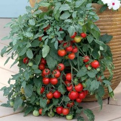 De kleinste tomaatjes in ons sortiment noemen we kerstomaatjes of pingpongtomaatjes, naargelang de grootte. Enkele variëteiten zijn langwerpig of hartvormig en krijgen navenant een iets andere benaming. Sommige zijn zelfs oorspronkelijke, wilde soorten. De meesten smaken extra zoet, een enkeling heeft een zoetzure smaak. Kerstomaten liggen het dichtst bij de oorspronkelijke soorten, wellicht daardoor zijn ze o.h.a. beter bestand tegen de gevreesde aardappelziekte. Een nieuwe generatie tomaatjes, de plant hoeft niet te worden opgebonden. In de vollegrond wordt de plant breed. Eigenlijk is ze het meest geschikt voor potten en “hanging baskets”. De trossen met kleine felrode kerstomaatjes hangen dan over de rand. Met recht een kostelijk gezicht!