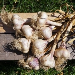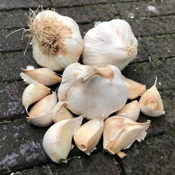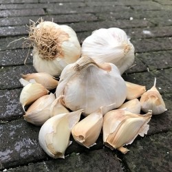 ZaaimethodeKnoflook kan jaarrond worden geplant, als de teentjes in goede conditie zijn. De meeste rassen zijn in herfst en winter op voorraad. Wij voeren rassen, die succesvol in Nederland worden geteeld. Meteen na ontvangst de bol openbreken en de tenen in de grond poten: 2-5 cm diep en 10-20 cm uit elkaar. In het najaar geplant staat de knoflook in februari (of eerder) al boven en in juni-juli kunnen ze geoogst worden. Later geplant betekent uiteraard latere oogst. Oogsten is geen verplichting, knoflook is winterhard en kan ook gewoon in de grond blijven. Na oogsten het loof vlechten zoals je knoflook wel eens in de winkel ziet en de bollen in de zon drogen. In de kamer zijn ze soms wel een jaar te bewaren! De teelt is niet moeilijk, maar goede tips vind je in onze teeltbeschrijving in pdf (zie onderaan de website). Knoflook schijnt luizen in b.v. rozen te weren, het proberen waard!