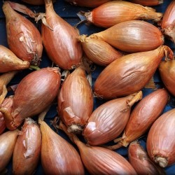 ECO GETEELD. Het in Frankrijk veel geteelde Jersey-type met uitgesproken slanke, langwerpige vorm. De schil is lichtkoperkleurig en de binnenzijde roze gevlamd. De smaak past in de kritische Franse keuken…! De bewaarbaarheid is zeer goed (8-12 maanden), we leveren gecertificeerd, virus- en aaltjesvrij plantgoed. De benaming Jersey slaat op de vermeende herkomst van de halflange roodbruine sjalot. Dit klopt echter niet daar de officiële voorouders van de sjalot uit het middenoosten komen, er is vervolgens verder gekweekt met dit materiaal in onder andere Normandië en daar is de halflange vorm geselecteerd.