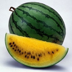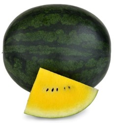 De meeste watermeloenen hebben rood vruchtvlees, het is dus leuk voor de afwisseling en de verrassing om deze geelvlezige variƫteit te telen! De smaak is net zo fris, zoet en sappig als de rode... Aan de buitenkant zijn de vruchten lichtgroen met donkergroene marmering, 24x20 cm groot en met een gemiddeld gewicht van 3-4 kg. Een vrij kleine watermeloen dus, die goede kansen biedt voor een ruime oogst onder glas.