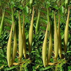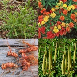 Een zeer veelzijdige plant, alle delen van de plant zijn (met mate) eetbaar. Bijen, vlinders en veel andere nuttige insecten zijn dol op de fraaie bloemen. De jonge bladscheuten (roerbakken) smaken als asperges, de toppen van de oudere scheuten eet je (kort gestoofd) als spinazie, de bloemknoppen en jonge vruchtjes van 3-4 cm (kort gekookt of in de wok) zijn heerlijk knapperig. De bloemen kan je koken tot een heerlijke siroop. Tijdens hete dagen hoopt zich in de bloemen zoveel nectar op, dat het kristalliseert en als mini-snoepjes kan worden gegeten. De genezende werking van de plant is al eeuwen bekend bij de Native Americans, bekend is het wortelextract, dat door deskundigen wordt aangewend tegen pleuritis, maar je vindt nog veel meer toepassingen op internet! De stengels van de afrijpende plant is een populaire vezelleverancier, het pluis in de rijpe vruchten is zacht als zijde en wordt gebruikt als vulling in kussens, vezel vor kleding en... als filter voor olievervuiling in de zee. Er zijn nog veel meer toepassingen, zie bijvoorbeeld de site van pfaf.org Tenslotte (last-but-not-least) is dit een behoorlijk winterharde, rijk bloeiende, zeer sierlijke plant in de tuin. Onze kweker laat ieder jaar van de mooiste kleuren en de beste takken de bloemen laten staan om er zaad van te plukken. Zo ben je verzekerd van de kleuren oranje, rood en geel. In de winter willen de planten niet nat staan, zorg dus voor goede afwatering. De bloeitijd is in juni-augustus op een hoogte van 70 cm. ZaaimethodeZaaien: in september-maart buiten op een zaaibedje zaaien, na de kou gaan ze kiemen. Van april-augustus zaaien kan ook, dan de zaden eerst een nachtje in water weken, vervolgens mengen met vochtige Perlite of Vermiculite, dit mengsel 2-4 weken in de koelkast zetten en vervolgens uitzaaien in potjes of op een zaaibed buiten. Leveringsmaandenhet gehele jaar