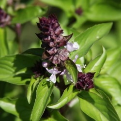 Een echte Thaise soort, combineert een goede smaak (anijs, zoethout, kokos, citroen en mango) met een fraai uiterlijk! Prachtig glanzend blad, groeiend in ronde vorm. Na enkele maanden ontstaan, over de hele plant verspreid, diep wijnrode bloemen.