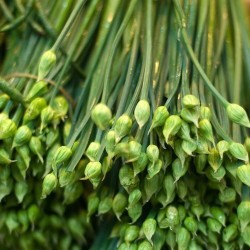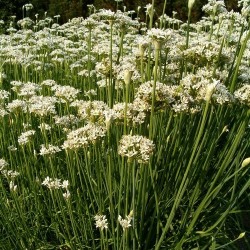 Beroemde bieslook vanwege de lichte en prettige knoflooksmaak. Het lange blad is plat in plaats van het pijpvormige blad dat je van gewone bieslook gewend bent. Zeer geliefd in de verfijnde keuken! De planten zijn zeer winterhard en bloeien heel rijk met witte trosjes (in tegenstelling tot gewone bieslook dat lila bloeit). De bloemen worden dankbaar en veel bezocht door bijen! In Azië wordt deze bieslook met de bloeistengels in knop geoogst: deze zijn heerlijk sappig en smakelijk.
