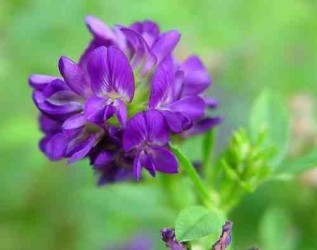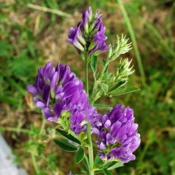 Halfhoge meerjarige plant met purperblauwe bloemen. Zaaien april tot juli, voor een goede doorworteling (waardoor structuurverbetering ontstaat) kan u het gewas een seizoen extra laten groeien. Regelmatig maaien mag. Deze vlinderbloemige is in staat stikstof uit de lucht te binden en op te slaan in de wortels. Bij afmaaien en doorwoelen komt deze beschikbaar voor andere planten. Dosering 200-250 g per 100 m2. De zaden dienen als kiemgroente en heten dan Alfalfa.