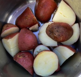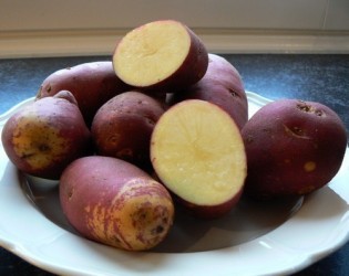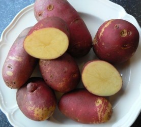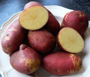 ECO GETEELDE AARDAPPELS. (1870) Lang is dit oude rasje “kwijt” geweest, gelukkig is iedereen aan het speuren naar oude streekrassen en kwam deze Zeeuwse, lekkere en iets kruimige aardappel weer uit het kleine circuit. Het is een zeldzame mutant uit de ‘Zeeuwse Blauwe’ (ook bekend als ‘Gelderse Blauwe’ of ‘Turken’), die waarschijnlijk al uitgestorven is en de naam dankt deze “bonte” aan de 2-kleurige schil, die rood met beige vlekken is. Het knolvlees is ongekookt tamelijk geel, na het koken wat witter. ‘Koopmans Blauwe’ is overigens ook een nakomeling van de ‘Zeeuwse Blauwe’, de verwantschap is te merken aan het zalvende mondgevoel: geen vaste aardappel, maar een structuur er tussenin. Ik vind hem heerlijk.