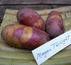 (2008) Het uiterlijk van deze rood-gele aardappel maakt al nieuwsgierig. De smaak spant de kroon: fijn van textuur, een uitgesproken vast aardappel, min of meer zoet met een tintje amandelsmaak. Het knolvlees is geel met soms een adertje rood erdoorheen. Eigenlijk is de naam ‘Mayan’ niet terecht: ‘Inca Twilight’ was beter geweest, de knollen groeien van oorsprong namelijk niet in het Mayan-gebied… De knollen lenen zich voor koken, bakken, (dunne) chips en frituren. Het is geen bewaaraardappel, dus meteen beginnen met smullen!