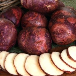 Zwarte aardappels vormen een onbekende groep in ons sortiment. De schil is dieppaars tot bijna zwart en het knolvlees is paars, gewolkt of wit. Om het verrassende effect van de kleur te behouden bevelen we aan om de knollen niet te schillen maar te wassen voor het koken. Planten vanaf half april, als de grond voldoende warmte heeft. Voorkiemen in het licht of in een grote pot mag eerder. Zet ze niet op een te natte plek, wel goed in de zon. De gemiddelde plantafstand is 70x40 cm, wij adviseren om 80x40 cm aan te houden om ziektes te voorkomen.