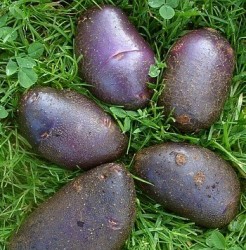 ECO GETEELDE AARDAPPELS. "Zwarte muisjes" noemen we dit Hongaarse ras, ze zijn donkerviolet van schil en wit van knolvlees en (voor een zwartschillige) tamelijk vast van structuur. De mooie ovalen muisvorm met weinig diepe ogen maken het ras aantrekkelijk om ongeschild te koken. Ze geven een grote oogst na de sierlijke lilawitte bloei.