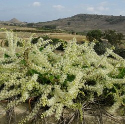 Dit houtige familielid van de Basella (klimspinazie) is in de (sub)tropen een echte bomen- of murenkiller net als bij ons de bruidsluier. De hard groeiende, rankende plant met sappige bladeren en volop (wrattige) luchtknolletjes bereiken een enorm gewicht! Voor ons is de plant niet winterhard, dus wees niet bang! Zet ze in een flinke pot met steunstokken tot een klimrekje gevormd en de plant verrast door frisse groei en heerlijk geurende, witte bloei.