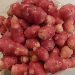 Heerlijke lichtroze knolletjes, fris en iets zoet van smaak. Dit is een mutant uit de Pink Perfection. Ze zijn zowel rauw door salades als gekookt, in de roerbakpan of gefrituurd te verwerken en eten. Jonge scheutjes en blaadjes van de oca zijn sierlijk en lekker pittig in salades!