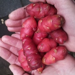 Heerlijke diepwijnrode, vrij grote knolletjes, fris en iets zoet van smaak. Planten maken langere uitlopers. Ze zijn zowel rauw door salades als gekookt, in de roerbakpan of gefrituurd te verwerken en eten. Jonge scheutjes en blaadjes van de oca zijn sierlijk en lekker pittig in salades!