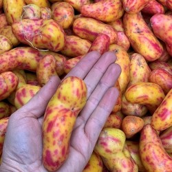 Gelukkig kennen steeds meer mensen dit bijzondere knolletje! In Zuid Amerika is het na de aardappel het belangrijkste knolgewas. Vooral rond het Andesgebergte (Ecuador, Peru en Colombia) is dit knolgewasje al eeuwen populair en in cultuur bij de Indianen. Net als de Yamboon behoudt de knol zijn knapperige textuur na het (kort) koken. Voor bakken of frituren zijn de knolletjes ongeschikt vanwege het hoge vochtgehalte. Het blad is eetbaar als spinazie, net als de zoete aardappel en de basella (van deze laatste is de Ulluco familie). De planten kruipen of klimmen met rankjes en zijn niet winterhard. Let op slakkenvraat, teelt op verhoogde bedden of in potten lukt erg goed vanwege de betere bodemwarmte. De oogst is laat in het najaar, enige bescherming met bijvoorbeeld vliesdoek helpt bij de knolzetting, vooral als september en oktober koud en guur zijn. 'Tiger' is geel-rood gestippeld en rond tot iets langwerpig van vorm.