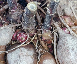 De planten worden gerooid zodra het blad teruggaat in levenskracht. Dat gebeurt meestal laat in de herfst door kou. De knol ziet er uit als een Dahliaknol, waarbij de functie van het stengeldeel dus essentieel is. Er kunnen veel zijknollen worden geoogst, enkele zijknollen met het stengeldeel in zand of opgepot overwinteren op een vorstvrij plaats. Tijdens de groei in de zomer kunnen stekken worden gesneden, zodat er ook jonge planten kunnen overwinteren, zo gaat de vermeerdering veel sneller.