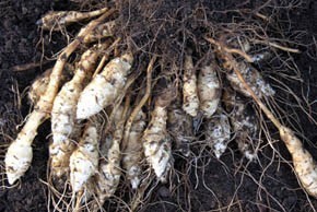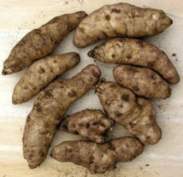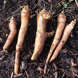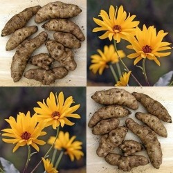 De Zonnewortel is een broertje van de Aardpeer (Topinamboer) en wordt in Europa (vooral door hobbyisten) gekweekt vanaf ongeveer 1850. Hij is afkomstig uit Noord-Amerika en de Indianen kenden natuurlijk al eeuwen zijn heerlijke knolletjes, die lijken op kleine dunne aardappels, maar met een puntig uiteinde, zoals de yam. Je kan ze rauw eten, geraspt met vinaigrette, of bereiden zoals aardappelen. Alle recepten van de Aardperen zijn op de Zonnewortel van toepassing. Verschil met de bekendere Aardperen zijn de slankere, gladdere knollen en de gegarandeerde bloei! Laat de knollen gewoon ‘s winters in de grond zitten of kuil ze op in vochtig zand, naar directe behoefte rooien. Let op: evenals de aardpeer is dit een plant, die zich gemakkelijk verplaatst door de tuin, geef ze een beperkte ruimte d.m.v. worteldoek of rooi (uiterlijk) in het voorjaar nauwkeurig. Leveringsmaandenmei t/m september