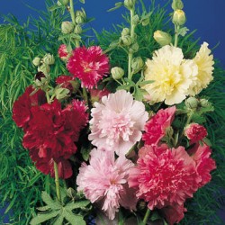 Voor wie liever niet te hoge stokrozen heeft biedt deze variëteit uitkomst: slechts 60-90cm hoog! De uitvoering is dubbelbloemig gemengd. Ze bloeien het zelfde jaar, mits uiterlijk begin mei gezaaid. Later gezaaide planten bloeien het jaar na zaaien.