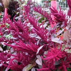Alles is rood aan deze plant (tot het plantensap toe!). De dieprode, zware bloeipluimen steken prachtig af tegen het donkerrode blad. De bloei is soms licht afhangend. Zet er eens een paar solitair! De bladeren en zaden zijn eetbaar.