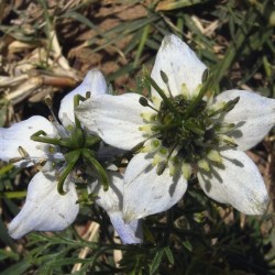 Een prachtig helderwit juffertje-in-’t-groen. Kenmerkend is het gemis van de groene kraag om de bloemen. Na de bloei ontstaan vruchtjes, die met kleine bultjes zijn overdekt. De zwarte zaden geuren als venkel en smaken naar peper en nootmuskaat. In Indonesië wordt dit specerij “kolonji” genoemd, in Rusland wordt het verwerkt in roggebrood