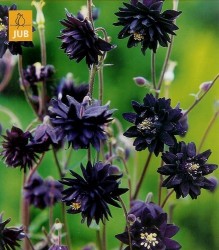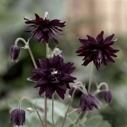 Typerend voor de bloemvorm zijn de kroonbladeren met korte of lange sporen en de enkele of dubbele kelkbladeren. Een zeldzame, mooie akelei met bijna zwarte, geheel dubbele bloemetjes. Hoogte 75-90cm.