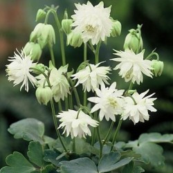 Typerend voor de bloemvorm zijn de kroonbladeren met korte of lange sporen en de enkele of dubbele kelkbladeren. Reinheid en schoonheid ademt deze zuiverwitte dubbelbloemige akelei met korte spoortjes. De bloemen steken statig boven het bladdek uit. Hoogte 60-75 cm.