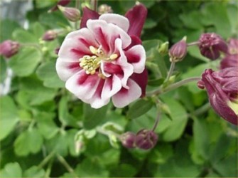 Pittige kleurtje: bloedrode kroonbladeren met korte sporen en enkele kelkbladeren, die dieprood met een wit randje zijn. Hoogte 35cm.