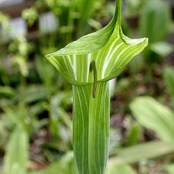 Op 80 cm hoogte groeien boven de fraaie, de handvormige bladeren de groen (meestal wit gestreepte) bloemschedes met een fraai bruin staartje aan de bloeikolf. Na de bloei ontstaan fraaie trossen met rode bessen, die het zaad bevatten. Dit soort is goed winterhard en zaait zich gemakkelijk uit.