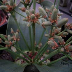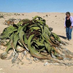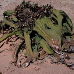 De wonderlijkste plant die ik ken, genoemd naar zijn ontdekker: Friedrich Welwitsch. De plant heeft maar 2 grote, brede bladeren en kan enorme droogte en warmte verdragen. Door de wind splitsen de bladeren zich, maar het blijven er echt maar 2! De wortels van de plant gaan zeer diep, reiken tot diepe ondergrondse waterbronnen en het blad neemt verder alle condens en spaarzame regen zorgvuldig op. De planten in de natuur zijn zeer zeldzaam, ze worden zeer oud en zijn vroeger helaas veel geroofd. Gelukkig zijn er nog reusachtige exemplaren van wel 2000 jaar oud bekend, gemiddeld worden ze 500-600 jaar oud! Geen wonder, dat elke botanische tuin zo’n unieke plant graag hebben wil… In het Afrikaans heet de plant treffend: “Tweeblaarkanniedood”. Wat moet ik nog meer vertellen van dit botanische wonder: het is een naaktzadige plant, net als veel naaldbomen en net als de bekende palmvaren: Cycas. Hoewel de plant niet hoger wordt dan 1,8 m, kunnen de bladeren uitgroeien tot elk 6 m lengte! Hoe droger de omgeving, hoe groter de plant. Je hebt een mannelijke en een vrouwelijke plant nodig voor zaadvorming en een zeldzame rode wants voor de bevruchting. Elk jaar kunnen we dus maar aan een paar honderd zaden komen, die we secuur over onze klanten verdelen, per bestelling kan je maar 1 zakje van 5 zaden bestellen.