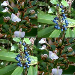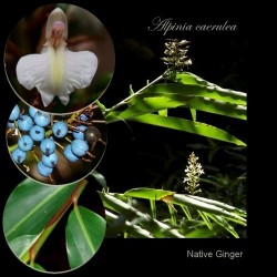 Blauwe gember dankt zijn naam aan de prachtige blauwe bessen, die na de fraaie witte bloei ontstaan. Deze tropische plant wordt wel 3 m hoog en houdt van een warme, vochtige omgeving op een half beschaduwde plaats. De gedroogde vruchtjes geven een heerlijke pittige smaak aan gerechten, het centrum van de jonge scheuten smaken als de echte gember. De wortels zijn iets aardser, maar toch voldoende gember-achtig.
