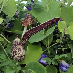 Klimmer met groot, hartvormig blad, die een flinke, elkaar overlappende bladmassa vormen. De verrassing vormen de spectaculaire bloemen, die een buitenissige vorm hebben: vanuit een blaasvormig, wit-paars gespikkelde basis groeit een grote paarse, smalle onderlip en een paars gespikkelde kleinere bovenlip... Je moet ze zien om het te snappen! De plant moet vorstvrij overwinteren.
