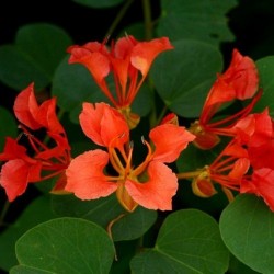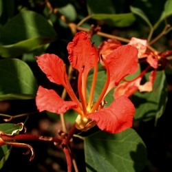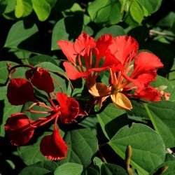310950. Een subtropisch bloemenwonder, een plekje in de vensterbank is uitstekend! In de zomer mag de plant op een beschut plekje buiten, een nachtvorst is geen probleem. De beloning is de jaar na jaar meer trossen steenrode kelkbloemen met 5 bloemblaadjes die met een dunne aanhechting wel lijken te zweven... De planten hebben enige steun nodig, in de natuur klimmen ze in andere struiken en bomen. Het hartvormige blad geeft een romantisch tintje… De bloemen, bladeren en vruchten van de plant zijn eetbaar!
